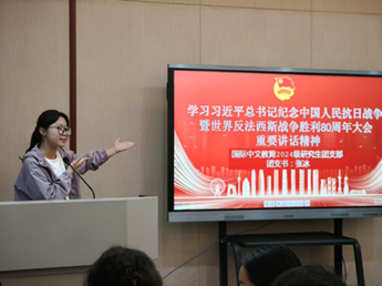 历史川流不息,精神代代相传。为深刻领悟书记在纪念中国人民抗日战争暨世界反法西斯战争胜利80周年大会上的重要讲话精神,激发团员青年的爱国情怀与使命担当,2025年9月19日,国际中文教育2024级研究生团支部在学院报告厅举办了“聚焦深入学习习近平总书记在纪念中国人民抗日战争暨世界反法西斯战争胜利80周年大会上的重要讲话精神”主题团日活动。团支部书记就重要讲话精神进行了领学,从抗战胜利的伟大意义、历史启示、伟大抗战精神的时代价值以及对新时代青年的殷切期望等方面进行了系统解读,团员们一起观看大中小学生思政大课,一起讨论电影《731》,与会团员结合观影感受与专业学习进行分享交流。作为国际中文教育领域的研究生,我们更应带头铭记历史,从抗战精神中汲取不畏艰难、自强不息的强大动力。同时也发出倡议,号召全体团员持续深化学习,将讲话精神内化于心、外化于行,以过硬的专业素养和昂扬的精神状态,投身到国际中文教育事业中去。
