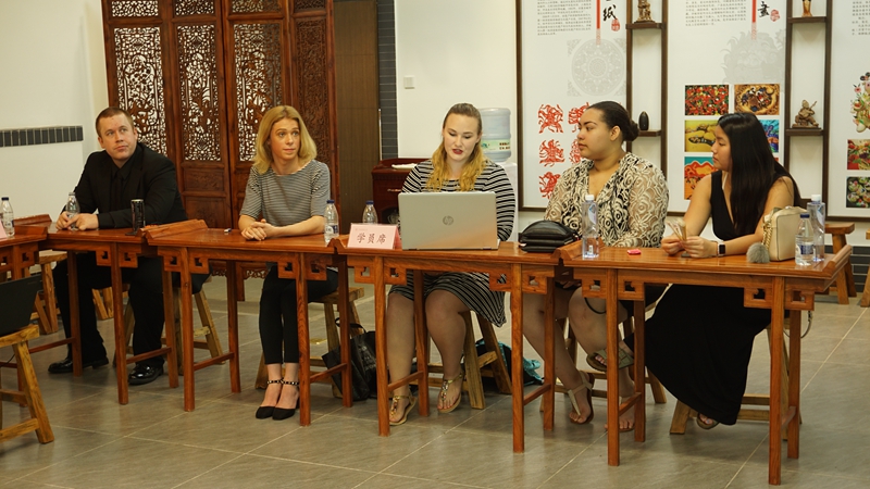 来自美国博林格林州立大学的5名学生分为两组做研修汇报,两组分别以当今中国社会中的环境污染、“剩女”现象为题,阐述自己的调查结果和观点看法,随后,中方语言小伙伴和美方学生就上述问题进行了讨论。研修汇报结束后,中美双方带队老师及项目负责人予以点评,对学生们的精彩表现给予了赞扬,为学生们对知识的活学活用感到欣慰,并勉励大家回到美国之后继续加强对中国传统文化及当今社会状况的学习和了解。