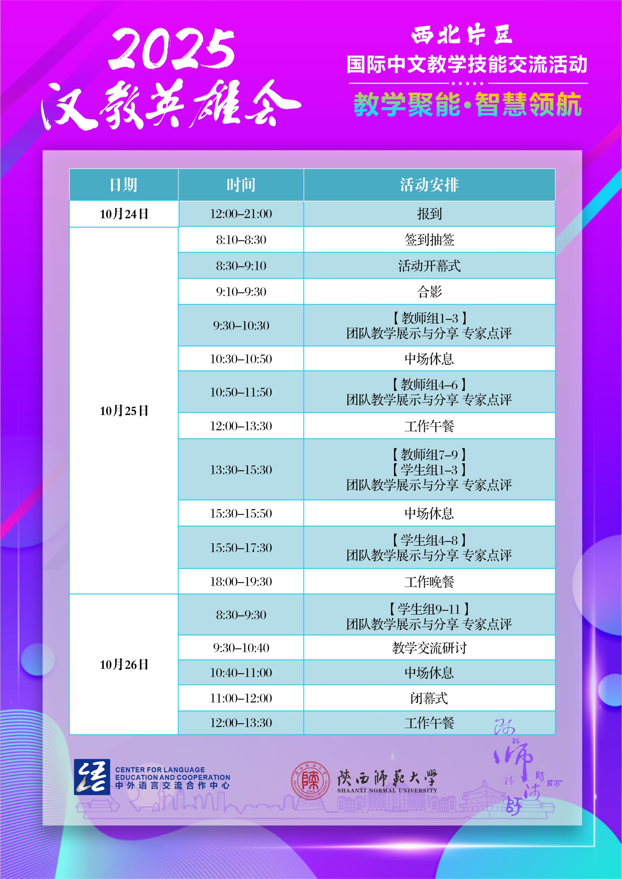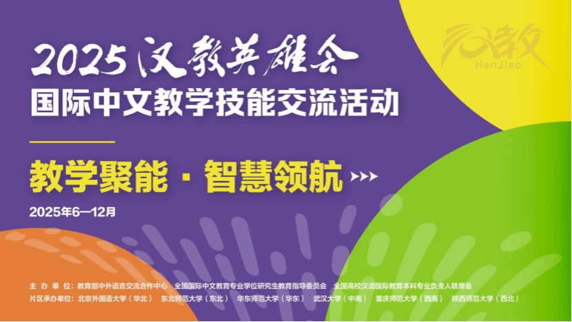 由教育部中外语言交流合作中心、全国国际中文教育专业学位研究生教育指导委员会、全国高校汉语国际教育本科专业负责人联席会联合举办,太阳集团官网承办的2025年“汉教英雄会”国际中文教学技能交流活动(西北片区)将于2025年10月24日-26日举办。届时将有9支教师团队、11支学生团队进行教学展示与分享,诚邀各校师生观摩、交流!